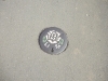 赤・黄色・白と色とりどりのマンホールふたが、道路に咲いています。手のひらに乗るような小型ですが綺麗です