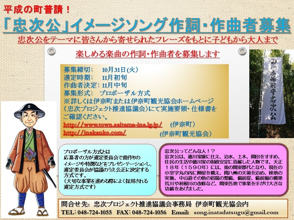 伊奈町の町名の由来となりました「伊奈備前守忠次公」を観光資源として活かしたまちづくり事業の一環としてイメージソングの作詞・作曲者を募集します!!
