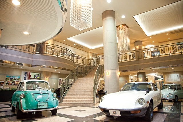 歴代カスタムカーや旧車が並ぶエントランス。