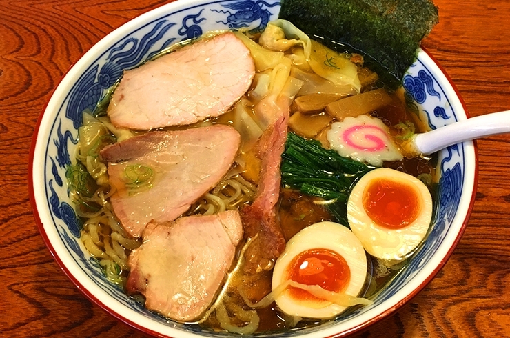 白河ラーメンならではの、あっさりながらコクのあるスープは、飲めば飲むほど醤油の旨みと甘みを堪能できる。自家製の麺は平打ちの縮れ麺で、つるつるモチモチの食感が楽しく、スープとの相性抜群。つるんと舌触りなめらかなワンタンは、ごま油の風味が◎。チャーシューは昔ながらのさっぱりタイプで、スモーキーな味わい。卓上にある玉ねぎのみじん切りを入れると、スープが一段とコク深く甘みもアップする。毎日でも食べたくなるような飽きのこないラーメンを是非ご賞味あれ。