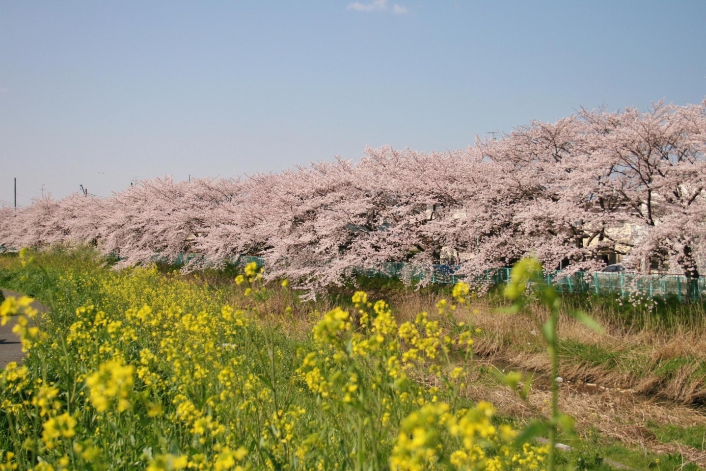 時期が重なると、栄5丁目、6丁目付近では菜の花も咲き、ピンクと黄色の見事なコントラストを堪能できます。フォトジェニックな景色をお楽しみください!