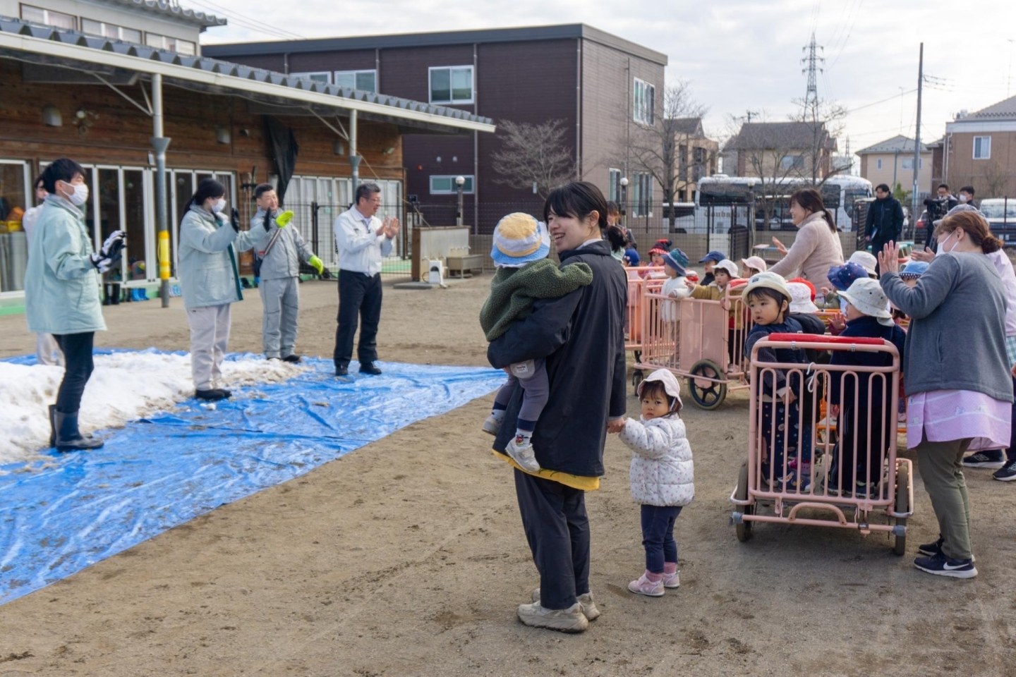 朝からの設営という重労働にも関わらず、園児を抱えてそりに乗せ、中腰でそりを受け止め、しゃがんで園児の雪を払ってあげ、すべり台をこまめに手直し。