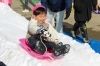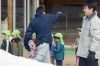 笑顔でそり遊びする園児を笑顔で見守る町職員ら