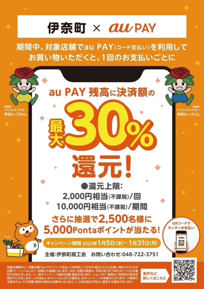 伊奈町の対象店舗でauPAY・d払い決済で得しちゃおう☆ キャンペーン期間は2022年1月5日~1月31日まで!