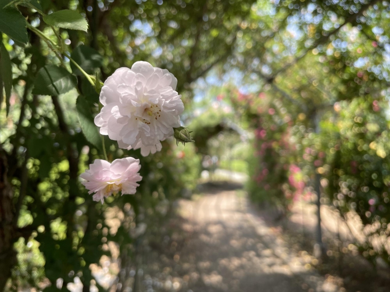 こんなにたくさんのツルバラを見るのは初めて! わくわくしながら小径を歩きました。「日本一長いバラのトンネル※」だけあって見ごたえたっぷり。カーブした小径を低いアングルから狙ってみたり、フォトジェニックな角度もたくさんあって、撮影が楽しめました。