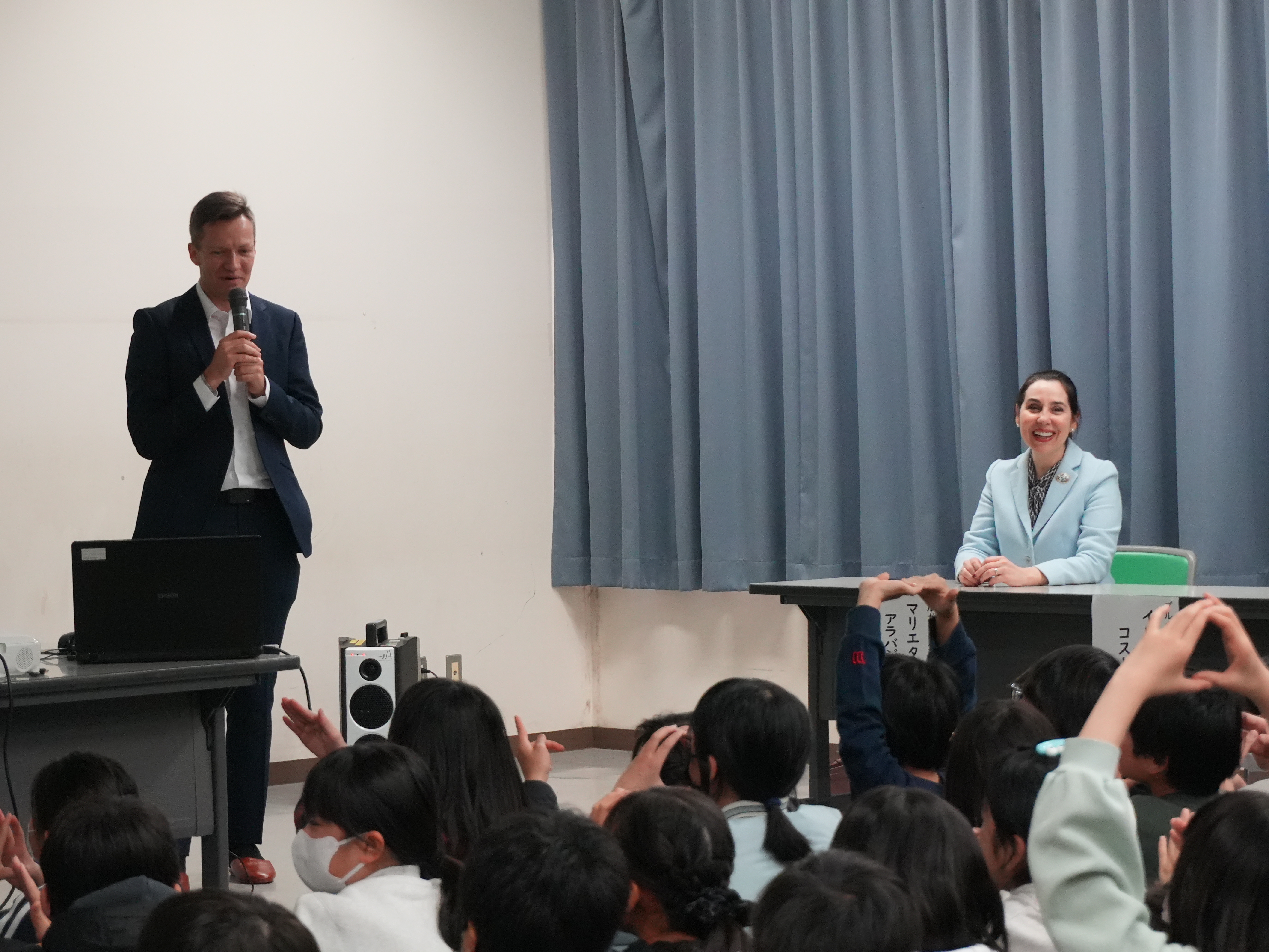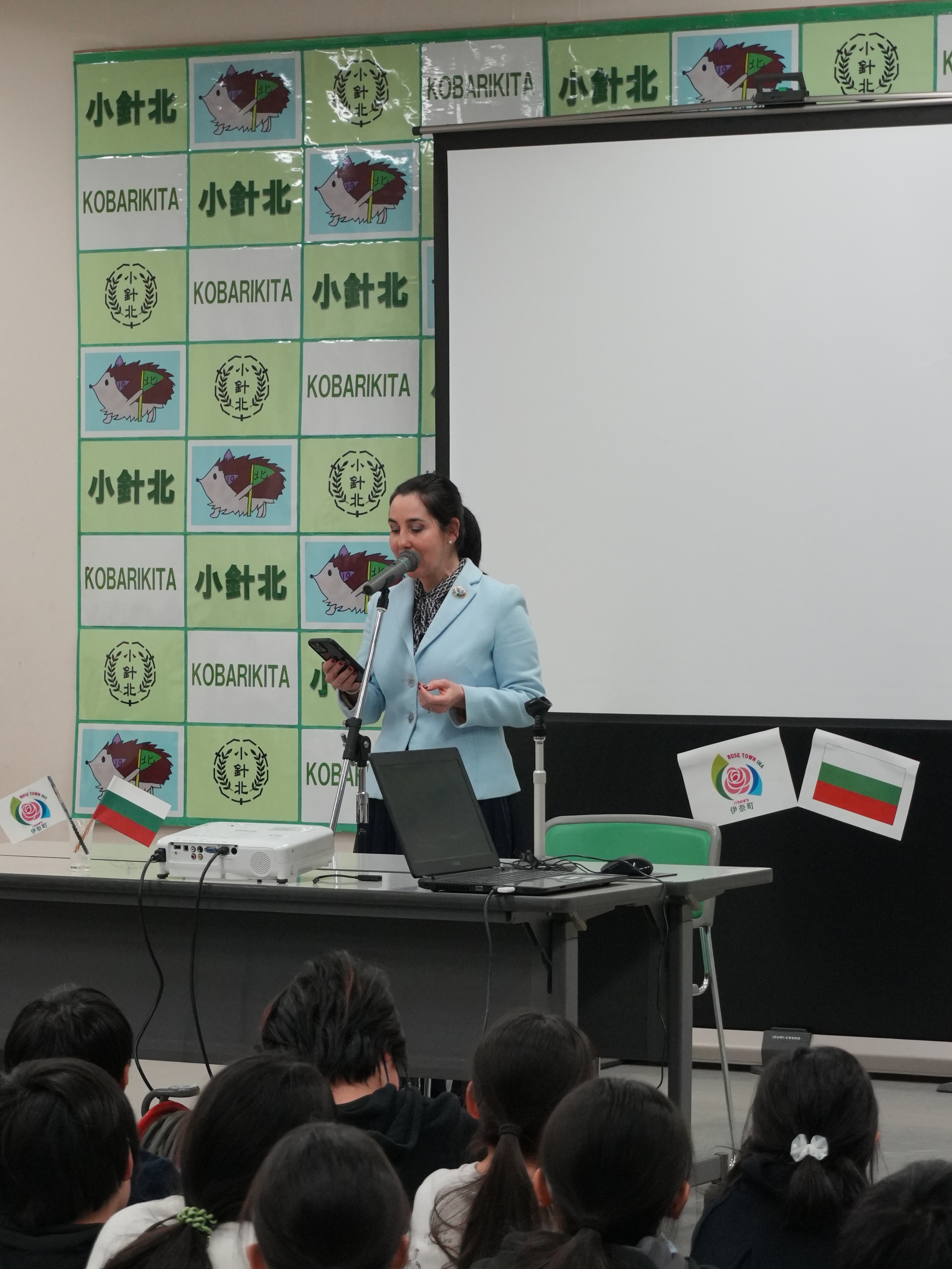 アラバジエヴァ駐日大使からは「ブルガリアの教育」について講義いただき、コストヴァ氏からはブルガリア語での自己紹介をご指導いただいた後「ブルガリアのバラ」などのご紹介、イワノフ氏からは、クイズ形式のプログラムが実施され、児童も積極的に参加し、大いに盛り上がりました。