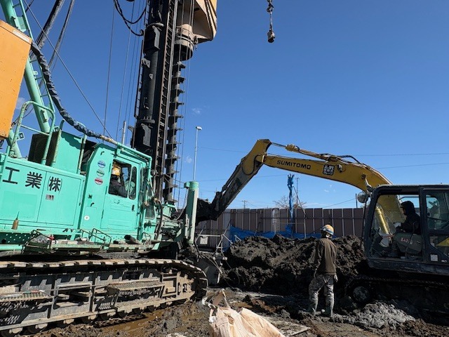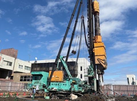 2月上旬に、新庁舎と別棟の山留工事が完了し、3月から新庁舎の杭工事が始まりました。
