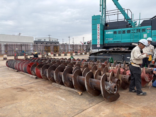 杭の中空部にオーガ(ドリル)を入れ、土を削りながら支持層まで杭を打ち込みます。杭先端でセメントミルクで大きな塊(拡大球根)を築造して杭と一体化することにより、高い支持力が発揮されます。新庁舎の基礎は、全長54メートル、直径80センチメートル〜120センチメートルの杭が37本入ります。